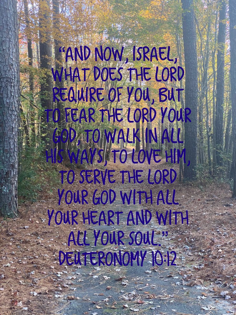 “And now, Israel, what does the Lord your God require of you, but to fear the Lord your God, to walk in all his ways, to love him, to serve the Lord your God with all your heart and with all your soul,” Deuteronomy 10:12